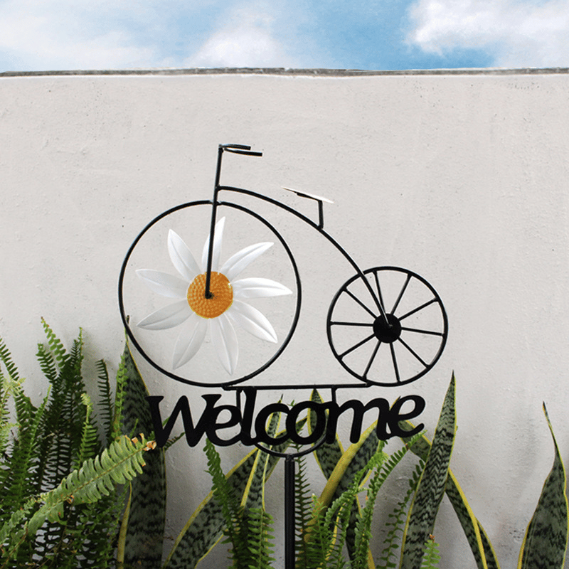 This fantastic, whimsical garden art features a vintage-style bike with a Daisy wheel and welcome sign, simple and sophisticated, adding a lovely landscape to the decor.