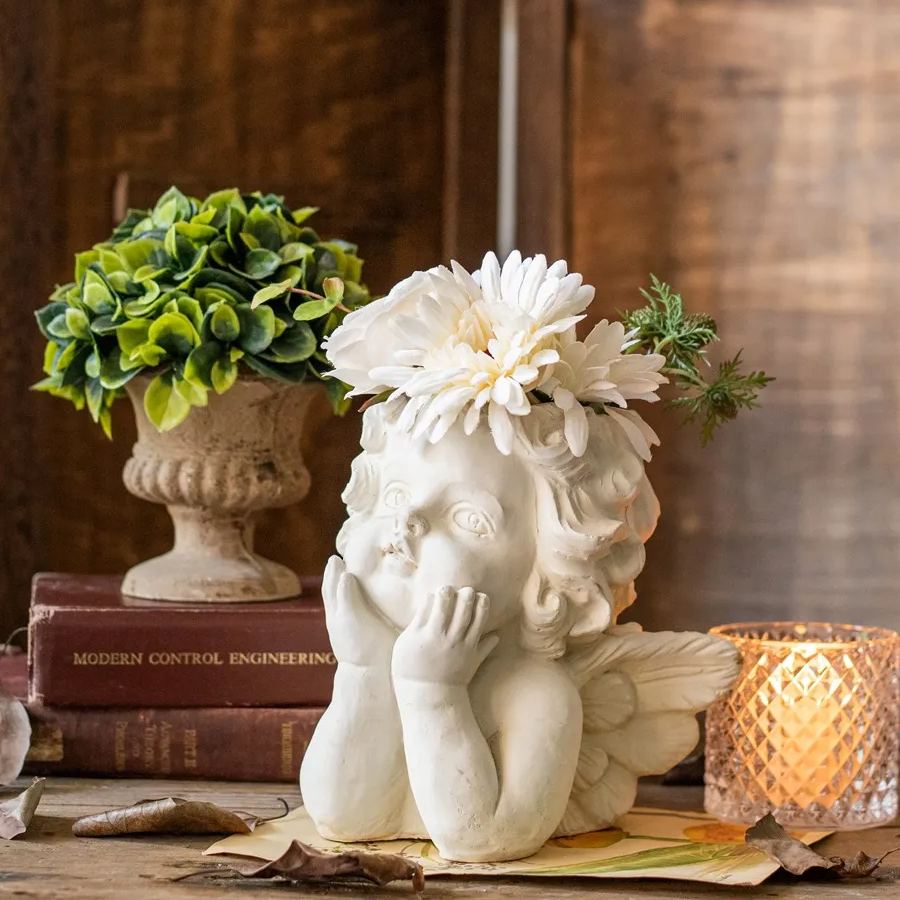 Angel Cement Planter: This Angel Cement Planter is a unique and creative way to display plants and flowers. This is a vintage angel statue planter made of safe and high-quality materials. It is durable and has a long service life. This is a concrete planter in a rustic farmhouse pottery style.